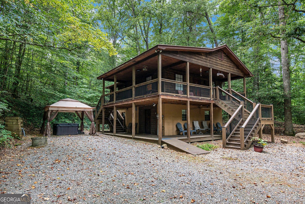 Pleasantly private and bordered by hundreds of acres of National Forest and just passed Swinging Bridge over the Toccoa River access road, this cabin is an amazing location for doing what you love in the mountains. Deemed Hemlock House sits hillside tucked away in the trees with the soothing sounds of the creek across the road. Great space with two bedrooms up and bath with classic claw foot tub/shower. Terrace level features private primary bedroom/bath with handicap access. No worries for those who find stairs a challenge, this cabin comes with its own elevator allowing everyone to enjoy every part of this beautiful property. Outside you will find the hot tub area with fire pit and hundreds of acres to hike, bike, or drive into the Swinging Bridge area. Wonderful rental opportunity fully furnished!