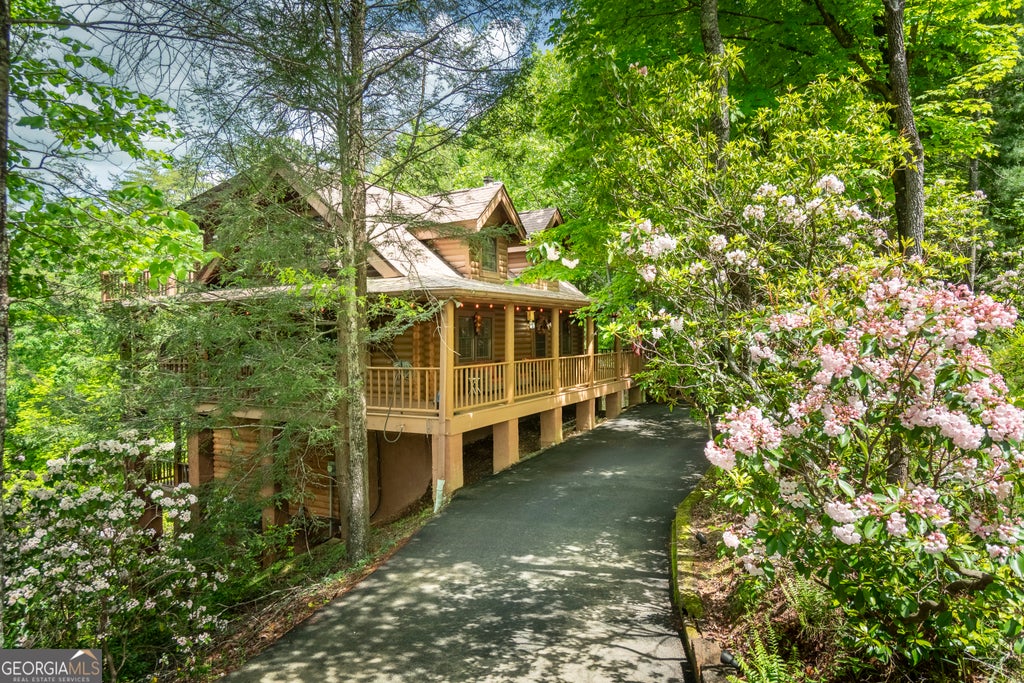 Come to the Skylake Community to relax in this traditional log cabin nestled in the woods. The newly poured pull through driveway makes for easy access and the exterior has been recently stained. Sit outside on the abundant decks to enjoy the flora and fauna and the sounds of nature. Inside you are greeted with a magnificent wood interior of hardwood floors, log exterior walls, and wooden beamed ceilings. A woodburning fireplace is the focal point of the Great Room making for a cozy setting on those winter days. The kitchen is spacious with a dining area and access to the screened in porch making it easy to entertain or to just sip on a warm cup of coffee and enjoy the view. The bedroom and bath on the main floor make one level living possible. The open stairway leads you up to another bedroom with its own bathroom and deck. Downstairs is an open concept that is separated by the stairway. It is currently used as another bedroom while still having plenty of space for a multi-purpose room. The recently installed Berber carpet keeps you toasty in the winter and the woodburning stove just adds to its charm. Using this as a second home? The furniture can be included. Skylake has hiking trails, tennis courts, pickle ball courts, clubhouse, two lakes, swimming pool, park and playground, just to name a few of the amenities. Convenient to Helen, Unicoi and Smithgall State Parks, Hardman Farm, and Sautee Nacoochee Arts Center among other local activities. Septic permit is for two bedrooms.