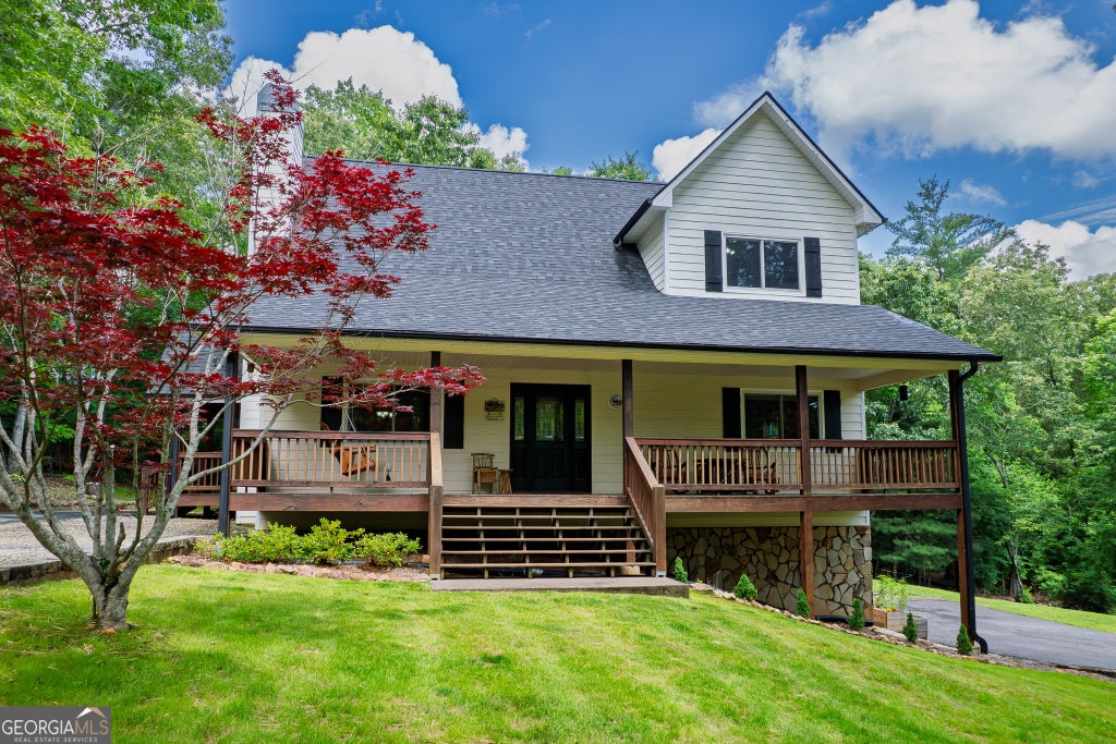 Welcome to your dream retreat in the scenic and serene High Country Crossing community! This beautifully maintained mountain home radiates warmth and character, nestled in a peaceful, established neighborhood where nature and comfort coexist. Step inside to soaring vaulted beam ceilings, a cozy stacked stone fireplace, and a spacious open-concept main floor perfect for entertaining or relaxing in style. The interior is a blend of rustic elegance and modern updates, featuring a partially all-wood interior, gleaming refinished hardwood floors, and stunning Brazilian Cherrywood kitchen cabinets and updated granite counters bring rich, timeless beauty to the space. Freshly painted throughout and boasting brand-new stainless steel appliances, this home is move-in ready. The main level also includes a covered side entry, washer and dryer, a large walk-in pantry, and a flexible suite, ideal for primary, guests or hobby. Upstairs, retreat to the oversized master suite with dramatic knotty pine walls and vaulted ceilings, offering that perfect cozy cabin ambiance. A loft area adds extra flexibility for guests or a reading nook. FURNITURE IS INCLUDED. Outside, soak in the tranquility from your expansive 400 sq ft front porch-ideal for watching hummingbirds and wildlife-or unwind on the private 200 sq ft back porch surrounded by towering trees that's already wired for your hot tub. A new roof (installed Nov 2022), a new Radon mitigation system, and new Anderson windows with transferrable warranty provide you with peace of mind for years to come. The finished basement with its own private entrance offers even more living space-perfect for a guest suite, home office, or long-term rental opportunity.