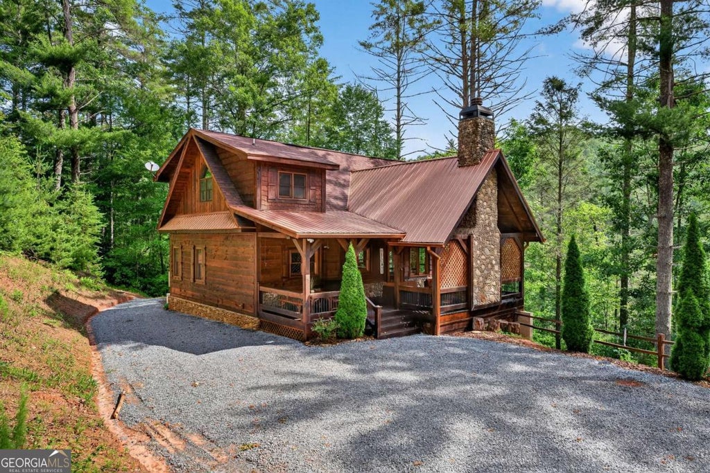 Location, location, location! Privately nestled in the sought-after Aska Adventure Area, this elegantly rustic 3BR/3BA retreat borders the Chattahoochee National Forest while remaining just minutes from hiking, mountain biking, the Toccoa River, Lake Blue Ridge, and downtown Blue Ridge. Beautiful craftsmanship shines throughout with large beams, stone accents, soaring cathedral ceilings, and dramatic walls of windows. The main level offers an open concept floor plan with a great room full of natural light, wide-open views, and a stone gas log fireplace. The spacious kitchen features custom cabinetry, stainless appliances, granite countertops, and plenty of dining space. A guest bedroom and full bath complete the main level. The upper level features a loft overlooking the great room (a perfect study, game spot, or home office nook) and a primary suite with a custom stone shower, separate soaking tub, and double vanity. The lower level includes a game room with a second kitchen, a second stone gas log fireplace, a guest bedroom, a full bath, and laundry. Outdoor living is a dream with a large covered party deck featuring a wood-burning stone fireplace, open wraparound deck, lower-level covered porch with hot tub, and plenty of space to enjoy the peaceful mountain setting. A whole-house generator offers added convenience plus peace of mind. Best of all, you're close enough to hear the rushing waters of the Toccoa River. This gorgeous mountain dream home is being sold turn-key and fully furnished. Don't miss this rare opportunity to own a fully furnished mountain retreat in one of Blue Ridge's most desirable locations. Schedule your private showing today and start living the mountain lifestyle you've been dreaming of!