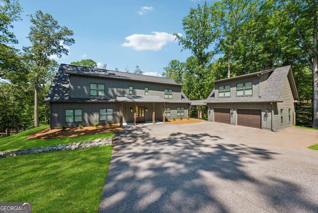 Welcome to this stunning modern decorator's custom home, perfectly situated on 4.5 acres with 338 feet of frontage on USCOE property and a private covered, single-slip dock in place. This thoughtfully designed, newer constructed 3-bedroom, 3.5-bath residence offers high-end finishes, luxurious features, and timeless style throughout. A welcoming foyer opens into an impressive two-story great room with an elevated gas/electric fireplace, seamlessly flowing into the dining area and a gourmet kitchen. The kitchen is a chef's dream, boasting Viking appliances-including a 36" gas range-custom cabinetry with drawer pullouts, quartz countertops and island, and built-in wine cooler. The main-level primary suite is a true retreat, featuring vaulted ceilings, a bold statement wall, custom window treatments, and an exquisite ensuite bath with double vanities, a stand-alone soaking tub, and oversized glass shower. A spacious, ready-to-customize walk-in closet completes the suite. Also on the main level, you'll find a stylish half bath, a coat closet, a fully equipped laundry room with soapstone work surfaces, pantry, built-in cabinetry, and a sink. Just off kitchen is a versatile flex room with leathered quartz counters-ideal as a home office, bar, or scullery. A screened porch at the rear of the home overlooks a peaceful, private backyard with a perfect area for future swimming pool, accented by hardwood trees and bordered by a spring-fed creek. A hidden rear staircase leads upstairs to a catwalk with views of the great room below and two additional bedrooms, each with its own private bathroom. Two large unfinished storage areas on the second level offer ample additional storage. The property also includes a detached two-car garage connected to the home via a covered breezeway, with a large unfinished bonus room above that's perfect for future guest quarters or a studio. A separate paved driveway provides extra parking or space for an RV. Outdoor living is enhanced by a 6-zone irrigation system that covers the front and back yards, and large garden area. Additional features of home include Revwood Luxury flooring, designer lighting, custom bathroom tile, a zoned HVAC system, tankless gas water heater, and AT&T Fiber availability. The home is handicap accessible on the main level with stepless entry and wide doorways in key areas. With no HOA fees and only light covenants, this exceptional property offers the rare combination of custom luxury, modern functionality, and peaceful lakeside living. Don't miss this opportunity to own one of the most distinctive homes in the area, within walking distance of Lake Lanier's Robinson Park and Boat Ramp.