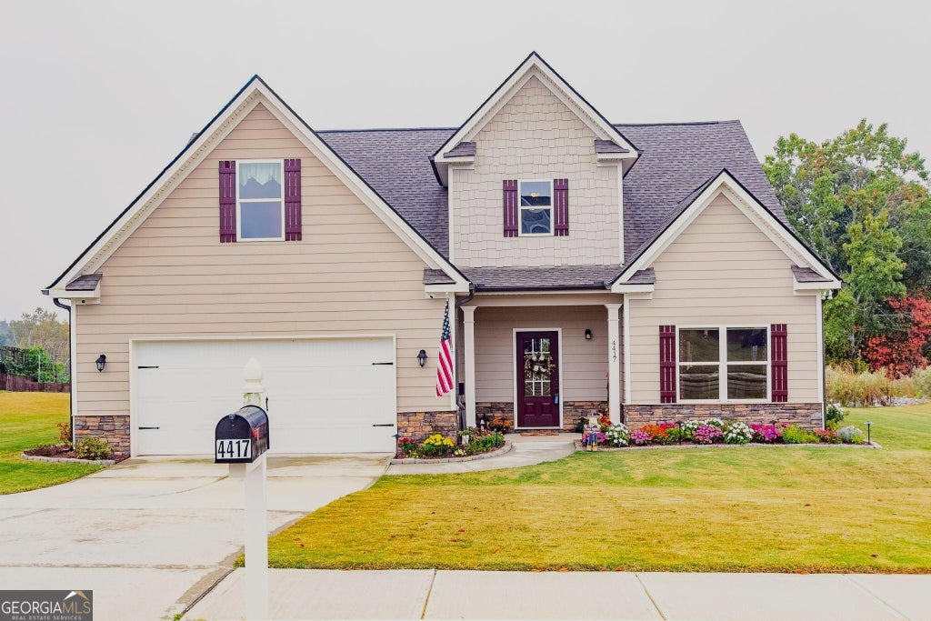 Located in the Highland Gates community, this home which is one of the larger plans than others on the market, offering privacy behind and a fenced yard with a manicured lawn and lovely planted areas designed with the gardener in mind. With a well built storage building, built for all your toys and tools. Off the great room is a covered patio retreat for gathering outside, rain or shine! Inside, you have an open kitchen to great room plan, a dining room, laundry, eat-in kitchen with double ovens and a large stainless steel sink. The powder room is conveninently located off the foyer. Installed for the best water quality is a whole house filtration system. The main floor primary suite is tucked away for added privacy. Upstairs are two bedrooms with baths for each and also enjoy the separate living space for crafts or separate entertainment choices. The double garage is large enough to house the seller's bass boat! A must for many who want to be close to the lake and rivers! And don't forget the bonus room which is great for an Office or a sports cave!! Call today for a personal tour of this immaculate property!