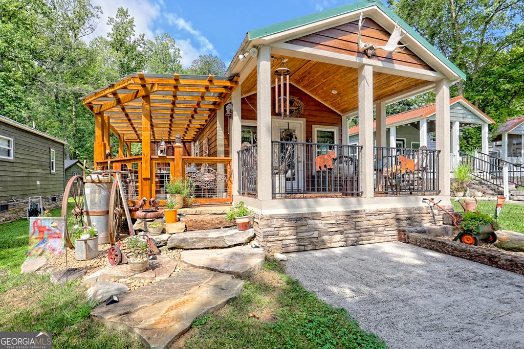Charming and low-maintenance, this cozy home at Sugar Mill Creek is designed for comfort, relaxation, and outdoor living. Large natural stone boulder steps lead to covered porches that welcome you and your guests. Inside, enjoy warm wood finishes, a cozy fireplace, and a thoughtfully designed kitchen with a double stainless sink, dishwasher, washer/dryer, pantry, and counter top seating. The expanded bedroom includes a 7' clothes closet with mirrored slider doors. The office area opens up to a private deck thru the glass sliding door. the deck leads to a 6 person hot tub and an outdoor kitchen counter with custom cabinets and outdoor dining area. A detached shed offers a workbench, wardrobe, and tool storage-plenty of space for your gear. The backyard is your personal haven, featuring a babbling brook, hammock, shade trees, and a stone fire pit-perfect for unwinding. Located in the gated, resort-style community of Sugar Mill Creek at Lake Burton, you're just minutes from local favorites like Bleu Canoe, Laprades Marina with four restaurants, hiking trails, waterfalls, and Lake Burton itself. Conveniently situated between Clayton, Helen, and Clarkesville, this is mountain living at its best-ideal for full-time residence or peaceful getaways. Come experience the perfect blend of serenity, adventure, and community. Since the owners occupied the residence part-time in the summer, the home looks pristine.