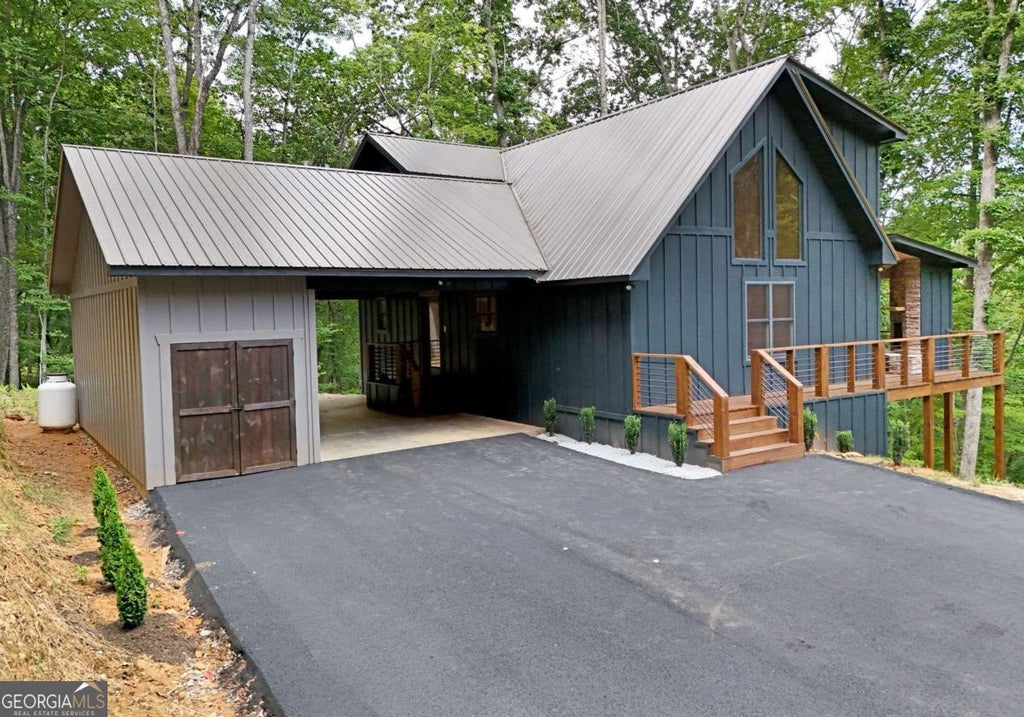 Discover your perfect retreat in this charming cabin nestled in the woods with seasonal views. The home is located minutes from Downtown Blue Ridge, just minutes away from Bear Claw Winery and Mercier's Apple Orchard. Set on a serene, less than 2-acre parcel with minimal restrictions, this property offers seasonal mountain views. Sitting on the front porch listening to music that nature freely provides, a true escape. Enjoy the convenience of a paved driveway that ensures easy access without the hassle of dirt roads, all while embracing the country lifestyle. The cabin features a carport and a large attached shed for storing your adult toys for your outdoor needs; kayaking, tubing, mountain biking, and more. Step inside to find beautiful woodwork that enhances the cabin's warmth, complemented by unique lighting that sets it apart from other homes. The open-concept design displays high cathedral ceilings with a continuous stone fireplace and an inviting atmosphere for all to enjoy. Each floor includes a bedroom with an attached bath, for comfort and privacy for you and your guests. Step into luxury with thoughtfully designed bathrooms, where every detail has been carefully considered. Each bathroom boasts the latest in modern design, featuring elegant tile work, stylish gold trim, and stunning granite countertops that add a touch of sophistication. The bedrooms complement the attention to detail, each adorned with unique light fixtures that enhance the overall aesthetic of the space. These fixtures not only serve a functional purpose but also contribute to the cabin's distinctive charm. Completing the charm of this cabin is the thoughtfully designed basement, which features a family room (game room) w/fireplace, a fridge within cabinetry. Unique fridge stores wines on one side & chills soda on the other. Enjoy the cozy bedroom and bath alongside space for members seeking privacy.