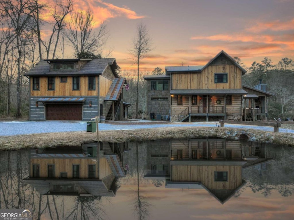 Welcome to the Toccoa Tailwater Fish Camp, a newly built 2024 lodge-style retreat offering over 300 feet of private Toccoa River frontage with a stocked pond on 6 acres. This one-of-a-kind property combines rustic craftsmanship with luxury finishes, designed for the ultimate fly-fishing and mountain lifestyle experience. The main lodge features 4 bedrooms, 3.5 baths, with 3 bedrooms facing the river, each with its own electric fireplace. Vaulted ceilings, cedar beams, chink-style siding, and designer fixtures enhance the warm lodge feel. Expansive windows frame river views while the chef's kitchen boasts granite countertops, custom cabinetry, and high-end appliances. The spacious party porch with a stone fireplace creates the perfect place to entertain while overlooking the river's natural rock shoals and waterfalls. The guest house, located above the 2-car garage, provides a private retreat with a living room, kitchen, 2 bedrooms joined by a bath, plus a loft for extra sleeping. A cozy covered porch with its own fireplace also faces the river, offering privacy and charm. Below, the custom speakeasy room is ideal for cocktails, games, or gatherings. Outdoors, a private stocked pond in the front yard is perfect for practicing your cast, while stone steps lead directly into the river to reach prime fishing holes. The gated entrance welcomes you into this fisherman's paradise, complete with thoughtful touches, true cedar log beams, and lodge-style details throughout. An additional buildable lot is included, featuring a 2-bedroom septic and power already in place-ideal for expansion or investment. Whether you're a serious angler, nature enthusiast, or seeking a luxury mountain escape, this property delivers an unmatched opportunity to own your private lodge on the Toccoa River.