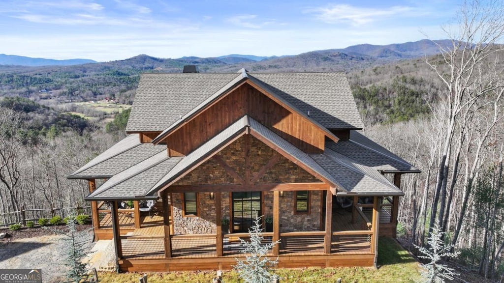 Sunset Ridge - Elevated Mountain Living in Mineral Bluff Set high on Roundtop Road with over four acres, Sunset Ridge offers sweeping views of the Blue Ridge Mountains and more than 4,200 square feet of finely crafted living space. The main level features a dramatic great room with floor-to-ceiling windows, vaulted ceilings, and a statement stone fireplace, flowing into a gourmet kitchen with dual islands, custom cabinetry, and high-end finishes. Four generously sized bedroom suites ensure comfort for family and guests, with two upstairs connected by a unique skywalk and private loft. The terrace level is designed for memorable gatherings-complete with a theater lounge, game area, wet bar, and fireplace-opening to expansive outdoor living spaces. Multiple decks, a fire table, and a hot tub provide opportunities to take in the sunrise, watch the sunset, or stargaze in the cool mountain air. Located just minutes from downtown Blue Ridge, Sunset Ridge blends refined design, exceptional entertaining spaces, and stunning natural surroundings in one unforgettable property.