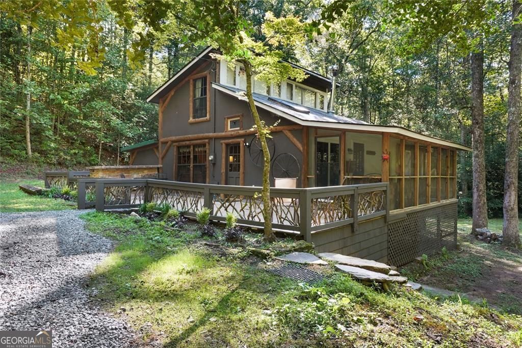 2BD, 2BA, 1400 sqft creekfront rustic mountain getaway cabin on 2.01 acres. Nestled in the North Georgia Mountains, this cozy retreat offers the music of a mountain stream and the peace of the National Forest just steps from your door. The home features a quaint cottage feel with a wood-burning stove and fieldstone surround, exposed log beams, rustic finishes and furnishings, and pine paneling throughout. The kitchen is equipped with an electric range, dishwasher, and stainless refrigerator. Two bedrooms are located on the main level, one with an ensuite bath, while the second bath includes a tub/shower combo and an adjacent laundry room. A loft provides two additional sleeping areas. Enjoy over 500 sqft of outdoor living space, including a deck with outdoor kitchen, covered and screened porch overlooking the creek, and a large fire pit perfect for relaxing and making s'mores. The forested property feels lush and private with ferns, mosses, rhododendron, and mountain laurel, while over 400 feet of USNF frontage invites endless exploration. Located near Tallulah Falls State Park and the Chattooga Wild and Scenic River, and just a short drive to Clayton, it's ideal for adventurers and nature lovers alike. Accessible via a private gravel road with a small creek ford crossing, the property offers seclusion yet convenience to Hwy 441/23/17. According to the longtime owner, the creek has never flooded in 30 years. Recently improved road access makes navigating Delilah Lane easier. Sold fully furnished and turn-key, this secluded, romantic cabin is perfect for unwinding, reconnecting with nature, or enjoying as a vacation home.