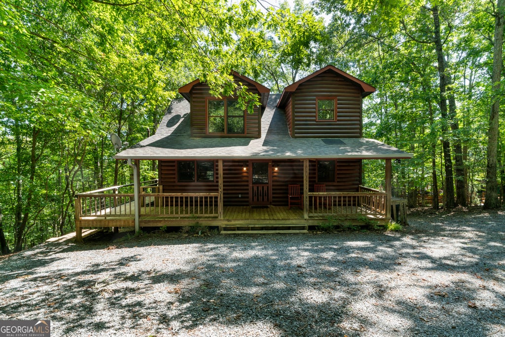 Escape to your private mountain sanctuary in the coveted My Mountain community! With the convenience of all-paved roads, you're just a scenic 10-minute drive from the vibrant shops and dining of downtown Blue Ridge. This immaculate, move-in ready log cabin is a rare find, perfect as a peaceful retirement haven, a multi-generational family retreat, or a high-demand short-term rental investment. Step inside and be greeted by the warmth of a spacious great room, where a crackling wood-burning fireplace invites you to unwind. The open-concept layout flows seamlessly into a modern kitchen, fully updated with brand-new stainless steel appliances. The main level also features a convenient primary bedroom with a full ensuite bathroom, complete with dual 'his & her' sinks. Ascend to the upper level to discover a second private bedroom suite, also boasting a full ensuite bath and double vanities, offering a perfect retreat for family or guests. The fully-finished terrace level is a game-changer, featuring a complete in-law suite ideal for extended stays or as a separate rental unit. This versatile space includes a cozy living area with a gas log fireplace, a brand-new kitchenette, a sleeping area, and a full bath. Your outdoor oasis awaits! Entertain and relax on the brand-new, two-story deck, perfect for grilling while overlooking your private, wooded lot. Spend your evenings sharing stories around the newly built stone fire pit or soaking in the hot tub on the peaceful, screened-in porch-a true year-round luxury. With recent major upgrades, an ideal location, and a floor plan built for comfort and income, this is the Blue Ridge opportunity you've been waiting for. Don't let this dream slip away. Schedule your private showing today and start living the mountain life!
