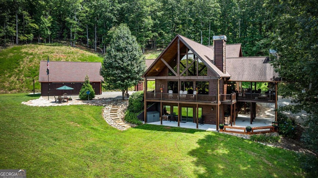 Gorgeous Mountain Lodge on 11.5 Acres!!! A True North Georgia Retreat Escape to your own private mountain paradise with this spectacular lodge, nestled on 11.5 pristine acres and bordered by U.S. Forest Service land for unmatched seclusion! Designed for both comfort and functionality, the property includes a versatile workshop/garage with storage space and a serene small stocked pond. Step inside the magnificent great room, where a dramatic wall of windows frames breathtaking vistas, while beautiful hardwood floors and a soaring stacked-stone fireplace with a Harman Pellet Stove insert set the tone for mountain lodge living at its finest. The open-concept design flows seamlessly into the large dining area and a chef's kitchen with recently upgrades appliances, featuring granite countertops, double ovens, prep sink, and a solid cedar 8-person bar perfect for gatherings. The main level offers two spacious bedrooms with walk-in closets, a stylish full bath with tiled shower, and a convenient laundry room. Upstairs, the expansive master suite impresses with a private deck, walk-in closet, luxurious spa bath with a 2-person tub, tiled shower, double vanities, and a private water closet. The terrace level is built for comfort and versatility, offering two additional bedrooms, full bath, wine and cigar room, wood-burning stove, safe room, and abundant storage. Outdoor living is equally impressive with wrap-around covered porches, a party deck with outdoor fireplace, and long range mountain views that set the stage for unforgettable entertaining or peaceful solitude. Modern comforts include dual HVAC systems (one dual fuel), tankless hot water heater, and energy-efficient Pella windows. This exceptional property is more than a home it's a lifestyle, where privacy, luxury, and natural beauty come together in the heart of the North Georgia mountains.