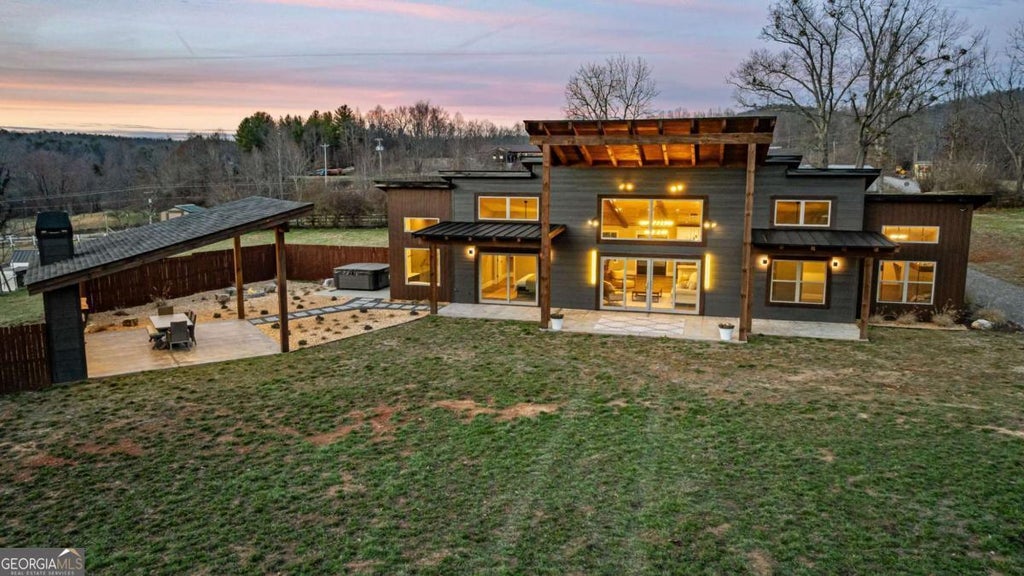 Welcome to your luxurious mountain modern escape, beautifully situated in the enchanting Blue Ridge Mountains, where breathtaking views of the U.S. Forestry Service envelop you. This exquisite 3-bedroom, 2-bathroom furnished cabin represents the pinnacle of refined living, offering an extraordinary fusion of rustic elegance and contemporary luxury-perfect for those seeking an ideal investment opportunity or a serene retreat. Upon entering, you are greeted by the inviting ambiance of all one-level living, where an open concept design effortlessly connects the spacious living and dining areas. Abundant natural light fills the space, creating a warm and welcoming atmosphere. The expansive primary bedroom is a true sanctuary that offers a spa-like en-suite bathroom complete with a cozy fireplace situated at the foot of a lavish soaking tub, all beautifully framed by the stunning mountain vistas that serve as a romantic backdrop for relaxation. Each generously sized walk-in closet is equipped with custom shelving for optimal storage solutions, and a separate laundry room enhances the practicality of daily living. Set on 1.94 level acres, this property is completely surrounded by a privacy fence, allowing you to immerse yourself in the breathtaking scenery in complete serenity. The outdoor space is truly an entertainer's paradise, featuring a charming pavilion that boasts both an outdoor fireplace and kitchen-perfect for hosting al fresco dinners or casual gatherings amid the natural beauty that surrounds you. A hot tub is already installed, providing the ideal spot to unwind after a day of adventures. With quick and easy access to scenic hiking trails, the iconic Swinging Bridge over the Toccoa River, and delightful local wineries, adventure and exploration are mere moments from your doorstep.
