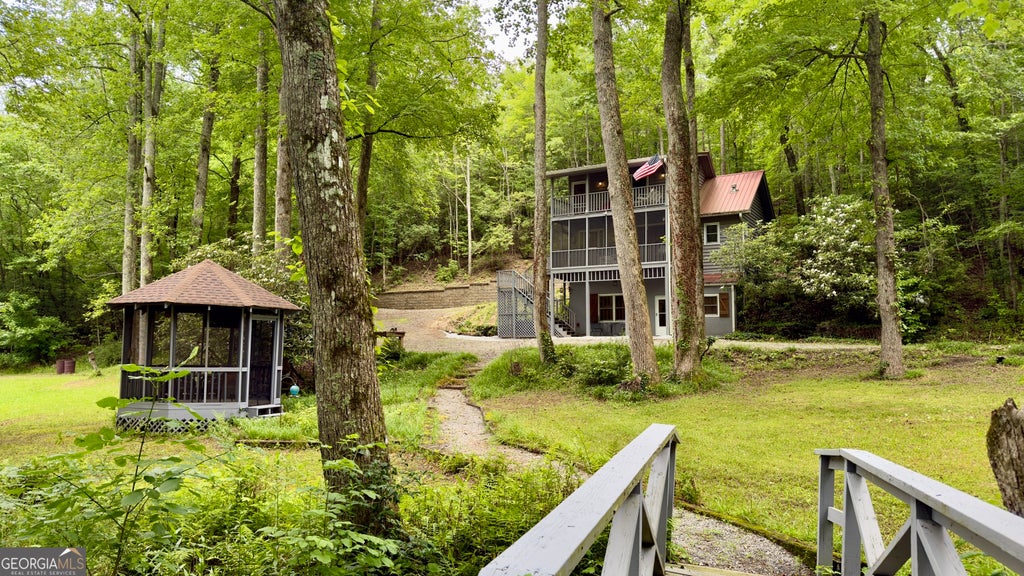 Mountain Retreat with Private Pond, Creek & Rustic Charm on 5.9 Acres! Tucked away in the heart of the North Georgia Mountains, this well-maintained mountain retreat offers peace, privacy, and natural beauty on 5.9 private acres. Whether you're looking for a full-time residence or weekend getaway, this property delivers it all-complete with a deck overlooking the private pond, and a rushing section of Mustang Creek with a cozy fire pit to entertain family and friends! Step inside to find a home full of rustic charm and modern comfort. The main level features a warm living area with a fireplace, kitchen, an oversized bedroom, and a full bathroom with a charming clawfoot tub. Enjoy mountain mornings or quiet evenings on the covered porch overlooking the property full of wildlife and natural beauty. Upstairs, you'll find a bedroom with its own full bathroom and a private covered porch-the perfect peaceful perch and great place to enjoy your morning coffee. The fully finished basement offers even more living space, including a bonus living area that can double as a bedroom, a full bathroom, a wood-burning heater, a laundry room, and a versatile storage /office space. Nature lovers will appreciate the wildlife, wooded surroundings, seasonal mountain views and proximity to outdoor adventures. The Wild Horse community backs up to the National Forest and is located just minutes from Helen, local wineries, restaurants, and schools-this property combines seclusion with convenience.