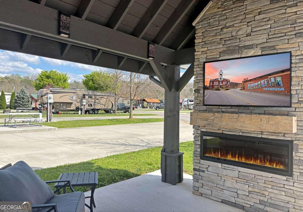 Discover the ultimate outdoor oasis with this exceptional lot that promises an unparalleled RV lifestyle! Envision your retreat with many conveniences finished for you: completed concrete work, with water and power lines already in place. This property features a versatile, insulated shed, perfect for storing your golf cart or creating a cozy retreat for the kids. There's more... At the heart of this lot is a stunning pavilion, designed with style and functionality in mind and elegant lighting that sets the perfect mood for evening gatherings. Picture yourself unwinding by the beautifully crafted stacked stone fireplace, watching your favorite shows on the TV while soaking in the breathtaking mountain views. But that's not all! The owner has thoughtfully prepared a space for a bar area, with cabinets and countertops ready for installation. For an additional $10,000, you can add custom cabinetry and countertops before closing, making this space ideal for entertaining or relaxing with friends and family. This is not just a lot; it's part of the RV lifestyle waiting to be embraced at our mountain destination in Blairsville, Georgia. Don't miss your chance to own the most astonishing lot on the block-where memories are made and tranquility reigns supreme! The property is nestled within the picturesque Georgia Mountains at Crossing Creeks RV Resort and Spa, a luxurious retreat on over 60+ acres of beautiful landscape. Immerse yourself in nature's tranquility, surrounded by the beauty of Coosa and Anderson Creeks. This lot is more than just a property; it's an invitation to embrace a serene lifestyle in one of North Georgia's finest RV communities. Enjoy amenities such as a fitness center, pools, a dog park, Pickleball courts, a community center, and much more. Your dream getaway awaits!