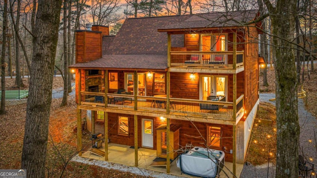 Welcome to your ultimate mountain retreat in the heart of the North Georgia mountains! Located less than 5 miles from downtown Blue Ridge, this beautifully appointed 3 bedroom, 3.5 bath cabin blends rustic charm with modern comfort - and it's already an established vacation rental, making it the perfect investment or personal getaway. From the moment you step inside, you're greeted by a warm and inviting Great Room featuring a stunning stack rock gas log fireplace, rough sawn wood floors, and walls of windows that bring the outdoors in. The spacious kitchen is designed for gathering, complete with stainless steel appliances, granite countertops, and a large island perfect for entertaining. The main level also features a private en-suite bedroom, along with a convenient half bath and laundry area - offering comfort and functionality for both owners and guests. Step outside to the covered porch and you'll find an exterior wood-burning fireplace and classic porch swing - the ideal setting for cozy mountain evenings and morning coffee with a view. Upstairs, the primary suite offers a spacious bath, large closet, and its own private balcony - a peaceful retreat after a day of adventure. The terrace level is built for fun, featuring a game and media area with a second gas log fireplace, wet bar, guest bedroom, and full bath - perfect for hosting friends and family. Just outside, enjoy the deck with a bubbling hot tub, sauna, and firepit area where stories are shared under the stars. And the fun doesn't stop there - this property even includes its own pickleball court, setting it apart as a true mountain playground. Whether you're looking for a profitable rental property, a weekend escape, or a full-time mountain lifestyle, this cabin checks every box - location, amenities, and unforgettable charm.